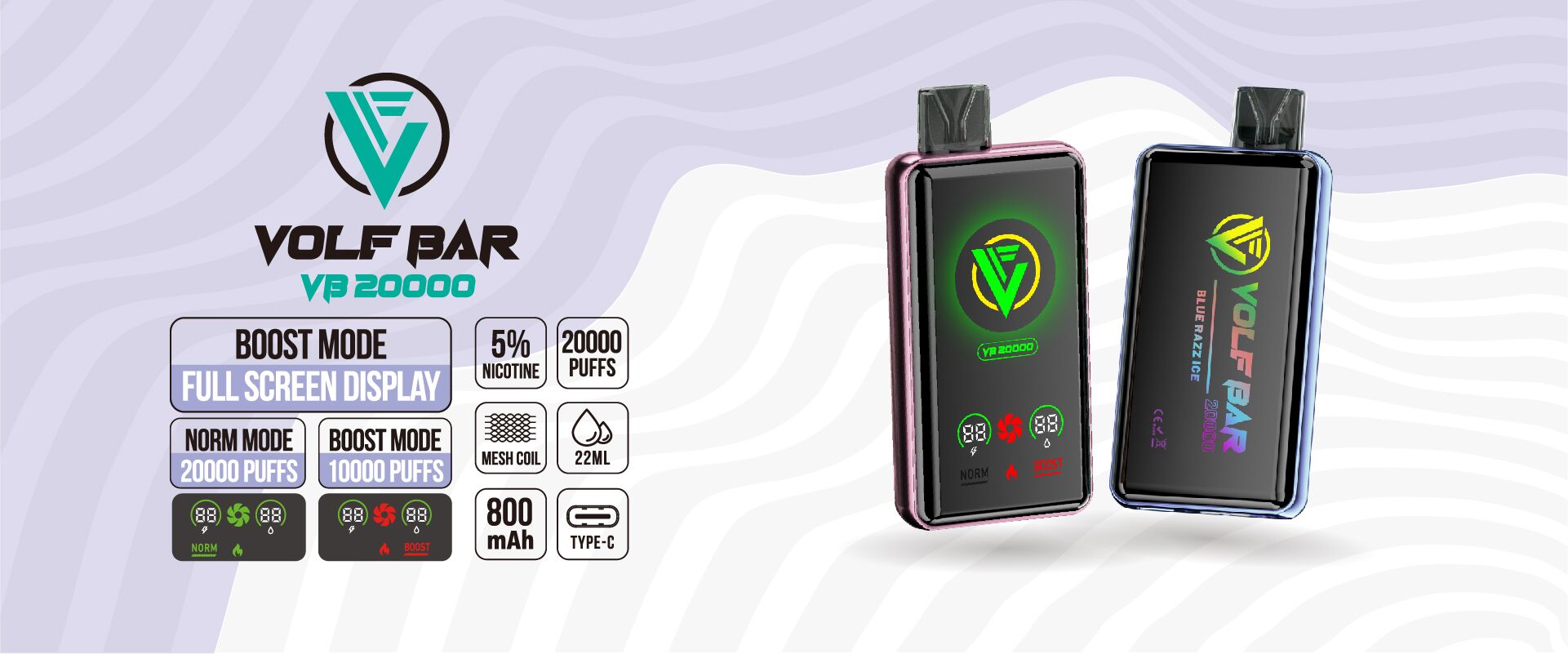 Introducing the VOLF VB 20000, a revolutionary disposable vape that boasts an astonishing 20000 puff capacity. This masterpiece integrates a vibrant full-screen display, a convenient Type-C charging port, and groundbreaking dual mesh coil technology. Pre-filled with 22ml of e-liquid infused with 5% nicotine, the VB 20000 further empowers users with a Norm&Boost mode switch, empowering them to tailor their vaping sessions to their personal preferences. Beyond sheer quantity, the VB 20000 excels in the quality of each and every puff. Its dual mesh coil technology unleashes a burst of intensified flavors, producing richer vapor and amplifying the overall sensory experience. Even as the battery dwindles, this innovative design ensures consistent flavor excellence.